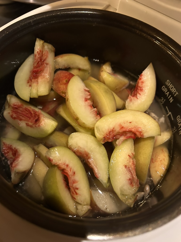- Wash and slice the fruit. Peel if you want, but not necessary — the skins add flavor. Remove cores/pits. Cut into wedges.