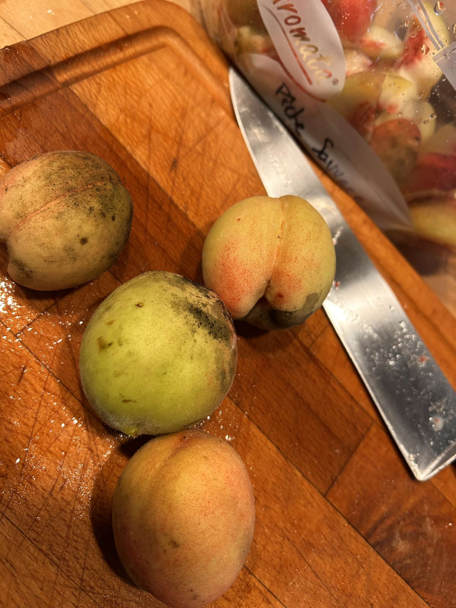 Roasted peaches with apples and gochujang pork chops is dinner tonight – with a savory fruit sauté. A cobbler later, maybe some will get fruit thrown into the wine. The point is using what’s at hand.