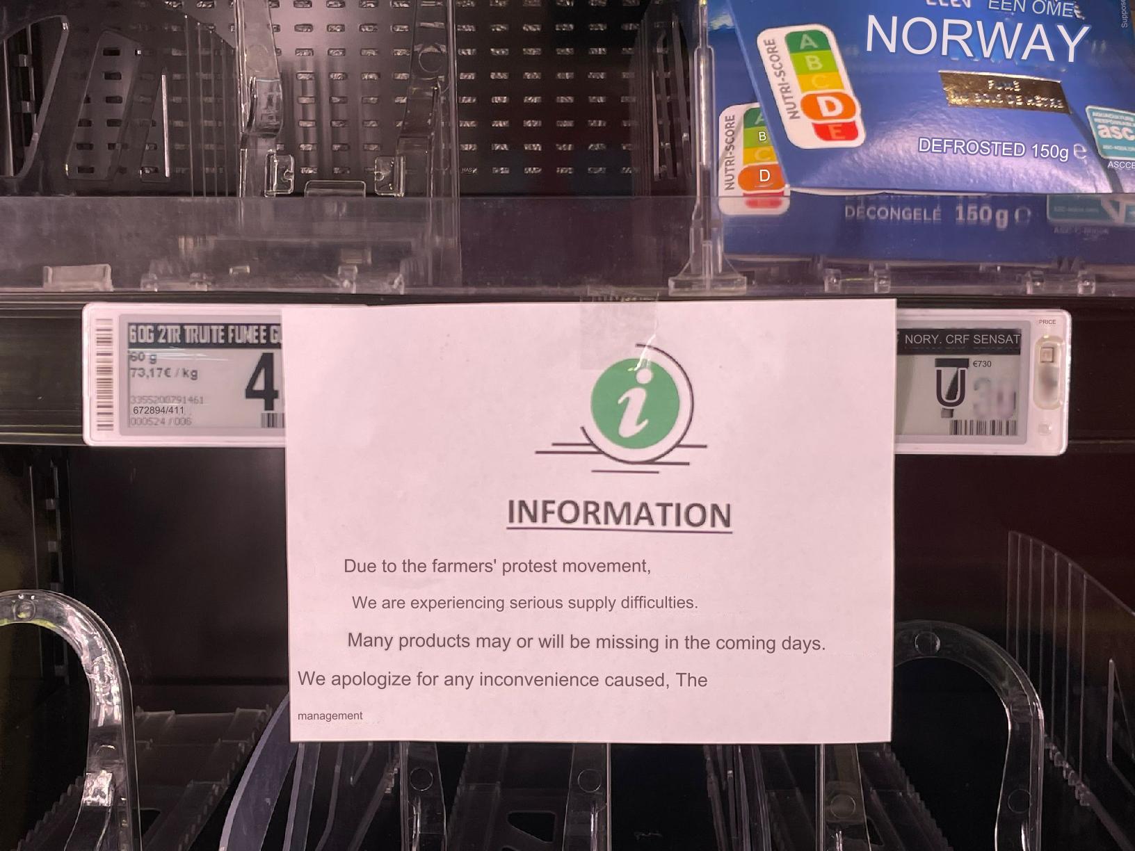 "Due to the farmers' protest movement, we are experiencing serious supply difficulties. Many products may or will be missing in the coming days. We apologize for any inconvenience caused, The management"