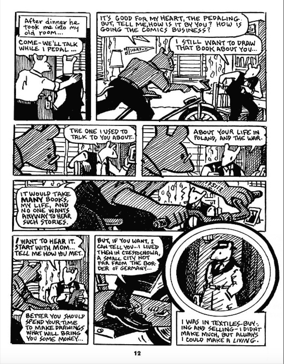 While Vladek pedals on a stationary bike, trying to maintain his health and routine, Artie smokes and pushes for emotional truth and almost exploits his father for more stories. And of course, Artie is Art Spiegelman, the author of the story who chooses to show himself this way.
