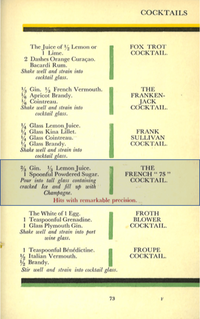 The French 75 first appears in Harry’s own 1924 bartending book, The ABC of Mixing Cocktails. In addition to the recipes, there are some good articles in the forward: “Your Glass of Wine” and “Results of Prohibition in U.S.A. in 1923” stand out. You can check the link or download them below.